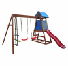 Комплектация: Металлоконструкция, комплект крепежа (болты, гайки, шайбы),пластиковые качели "3 в 1" (для детей до 3-х лет), пластиковые качели "Лодочка" (дети3-14 лет), (болты, рым-гайки, шайбы, карабины для крепления качелей), канат (длина 2 метра).
